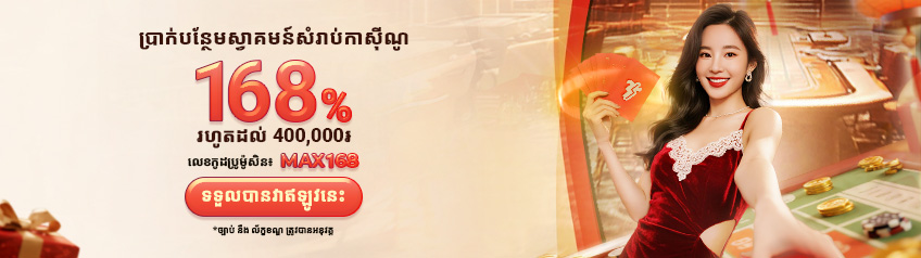 - ដាក់ប្រាក់ដំបូង ហើយយើងនឹងផ្តល់ប្រាក់បន្ថែមស្វាគមន៍ 168% រហូតដល់ KHR 400,000/USD 100 ដើម្បីលេងនៅលើ SBO កាស៊ីណូផ្សាយផ្ទាល់