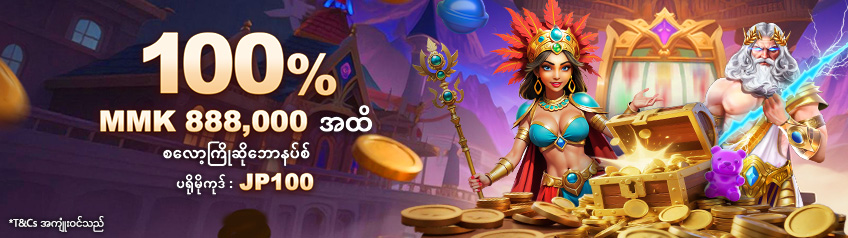 - စလော့ဂိမ်းများအတွက် 100% ဘောနပ်စ် MMK 888,000 အထိ ရယူနိုင်ရန်ဦးစွာငွေသွင်းပါ။