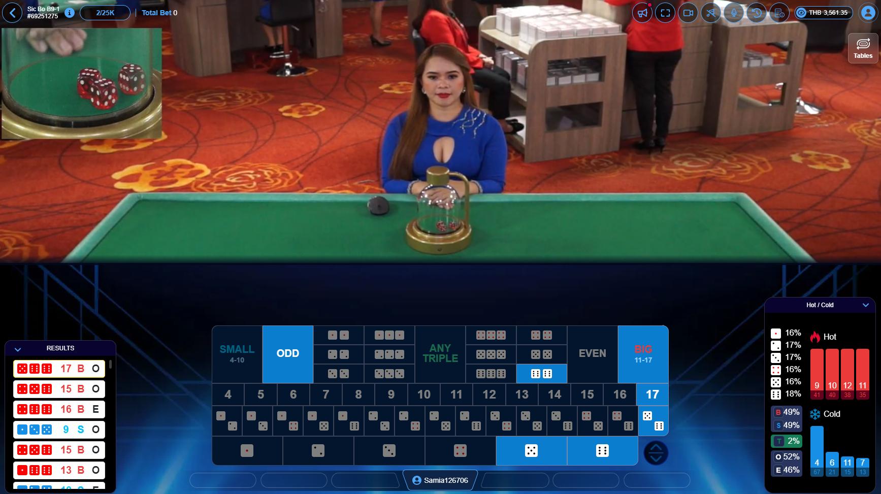 3 つのサイコロの出た目を当てるゲームです。同一テーブルで複数ベットすることができます。1~50 種類の異なるベット方法から選択でき、それぞれ配当も異なります。