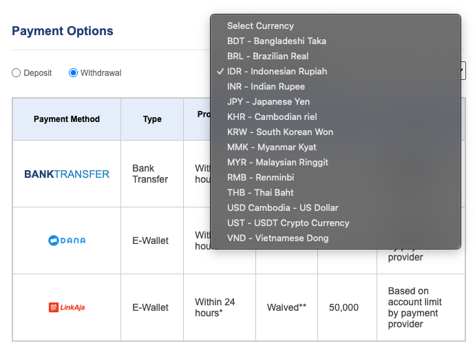 The payment methods available depends on the currency you are using when registering for your SBOBET account and your country of residence.